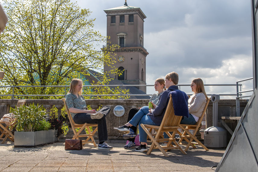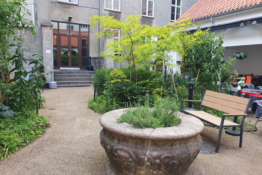 På toppen af fortrappen har vi en fin tagterrasse med udsigt til Rundetårn, Domkirken, Rådhustårnet, Christiansborg, Marmorkirken. Her er der mulighed for at grille, slikke sol eller nyde solnedgangen over København.