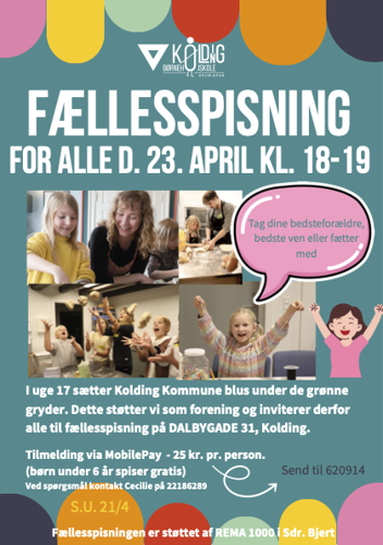 Tilmelding via MobilePay (tlf. 620914) 25 kr. pr. person (børn under 6 år spiser gratis) senest 21. april