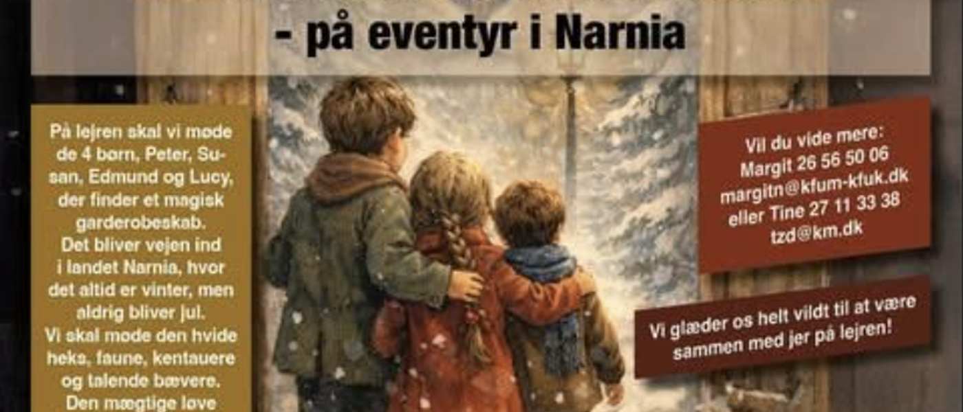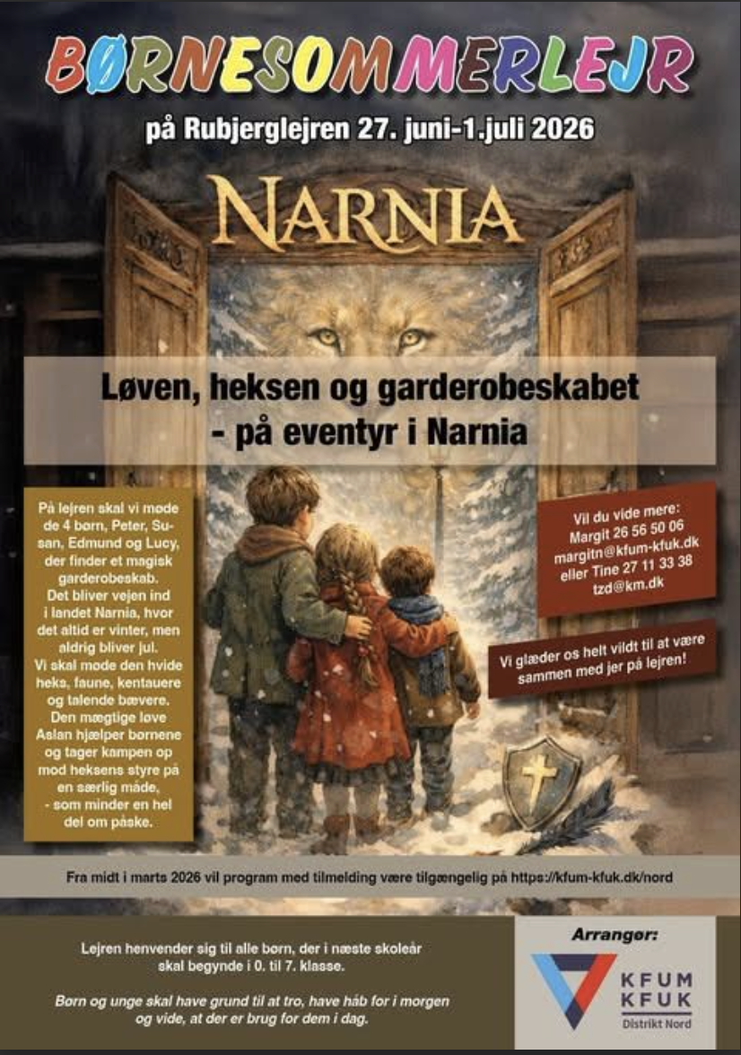Nu er det blevet tid til børnesommerlejr 2026, hvor vi mødes i 1. uge af skolernes sommerferie på Rubjerglejeren og sammen træder ind i et nyt og spændende Narnia-univers.