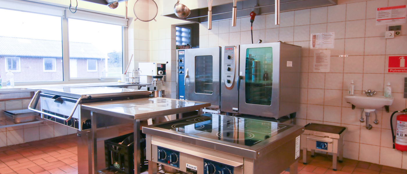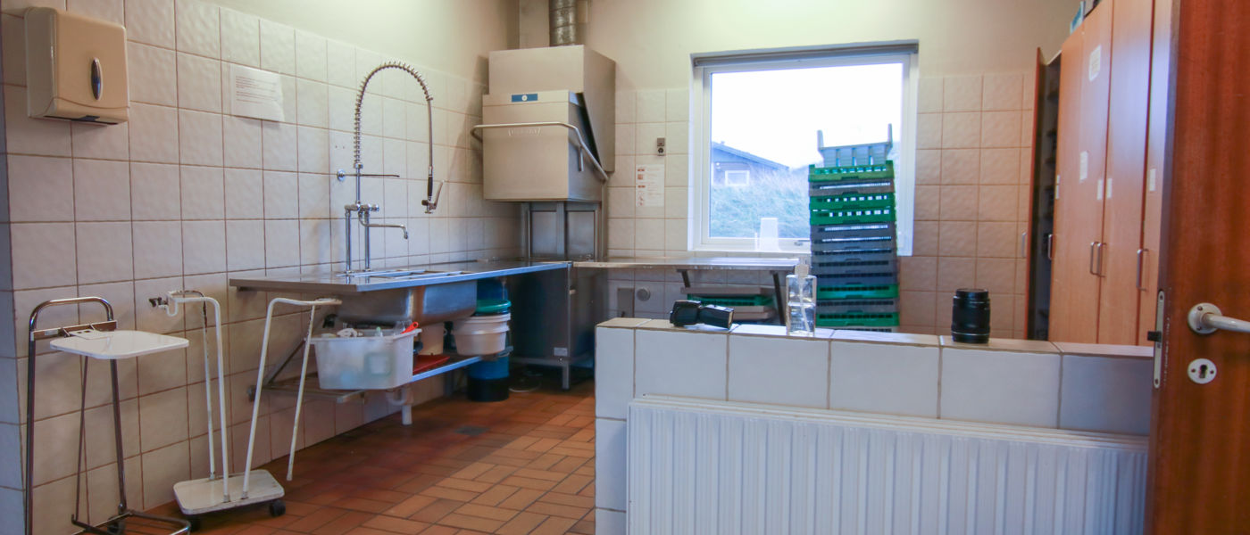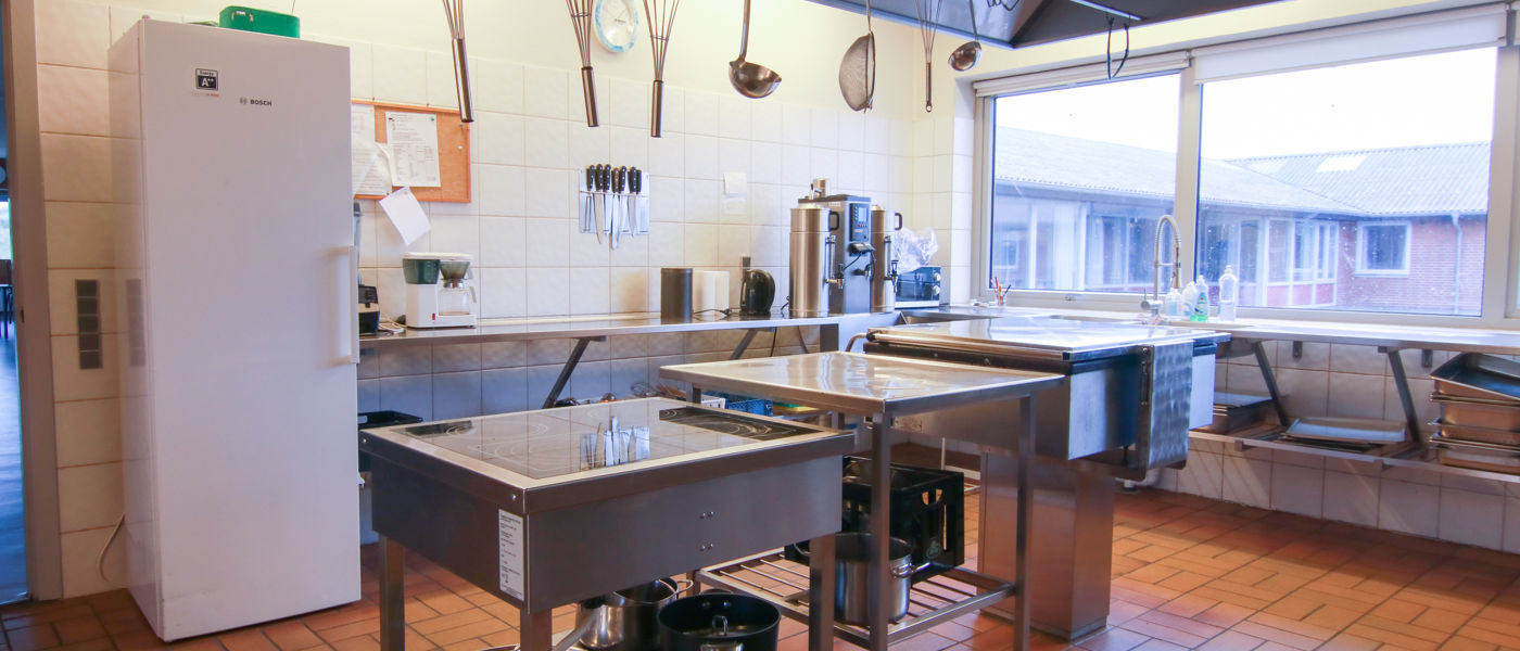 Køkkenfaciliteter: Opvaskemaskine, 2 konvektionsovne, rørmaskien, kipsteger, kaffemaskine, kartoffelskræller, service til 100 personer
