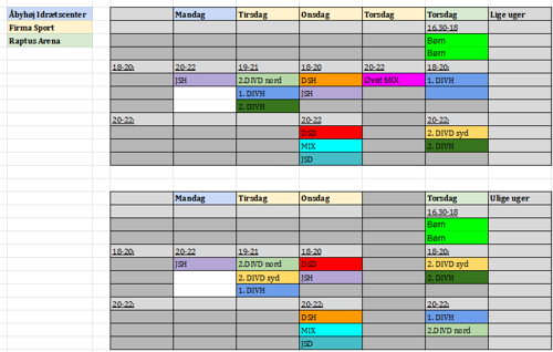 De samme træningstider ses i tabellen herunder: