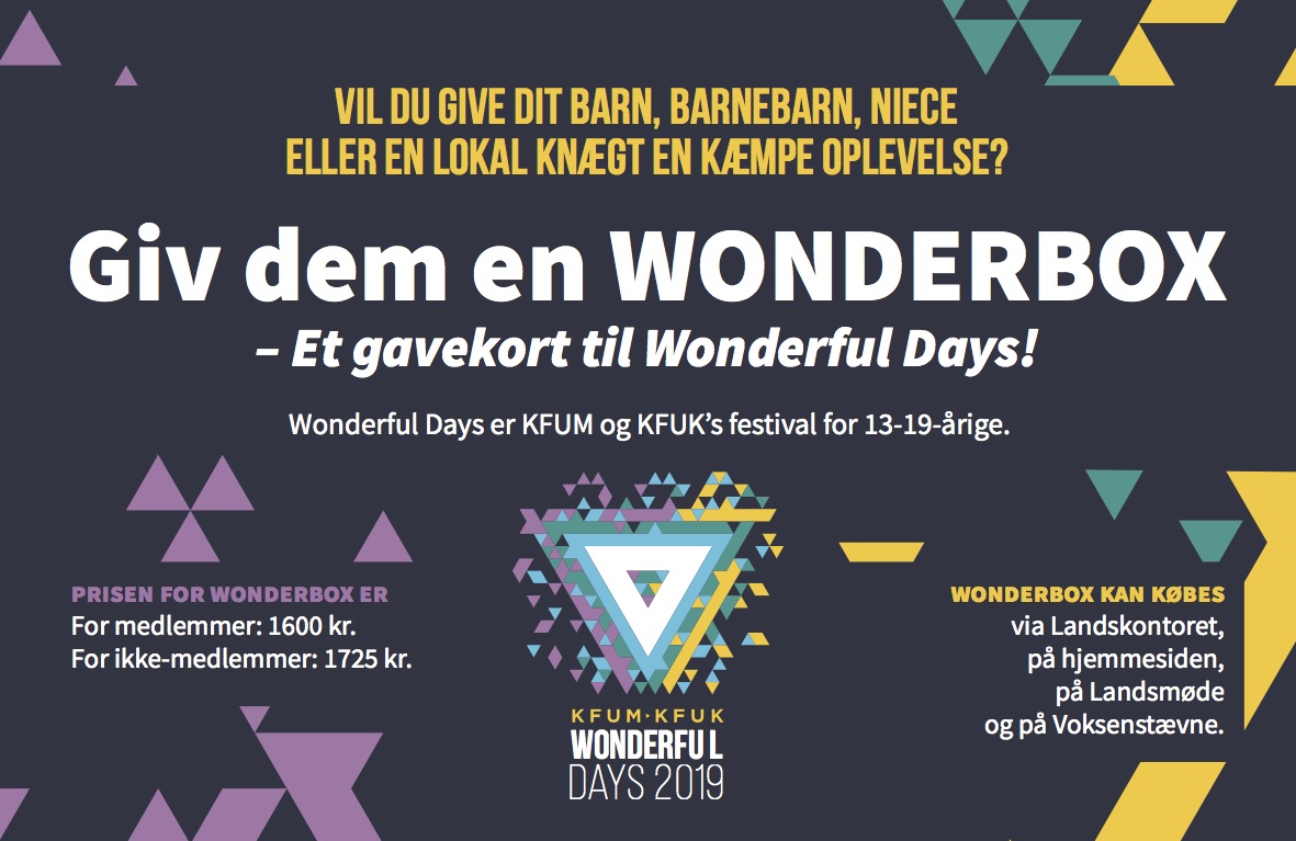 Vil du give en af dine kære en kæmpe oplevelse? Køb en Wonderbox! En Wonderbox er et gavekort til en billet til KFUM og KFUKs Festival: Wonderful Days 2019.